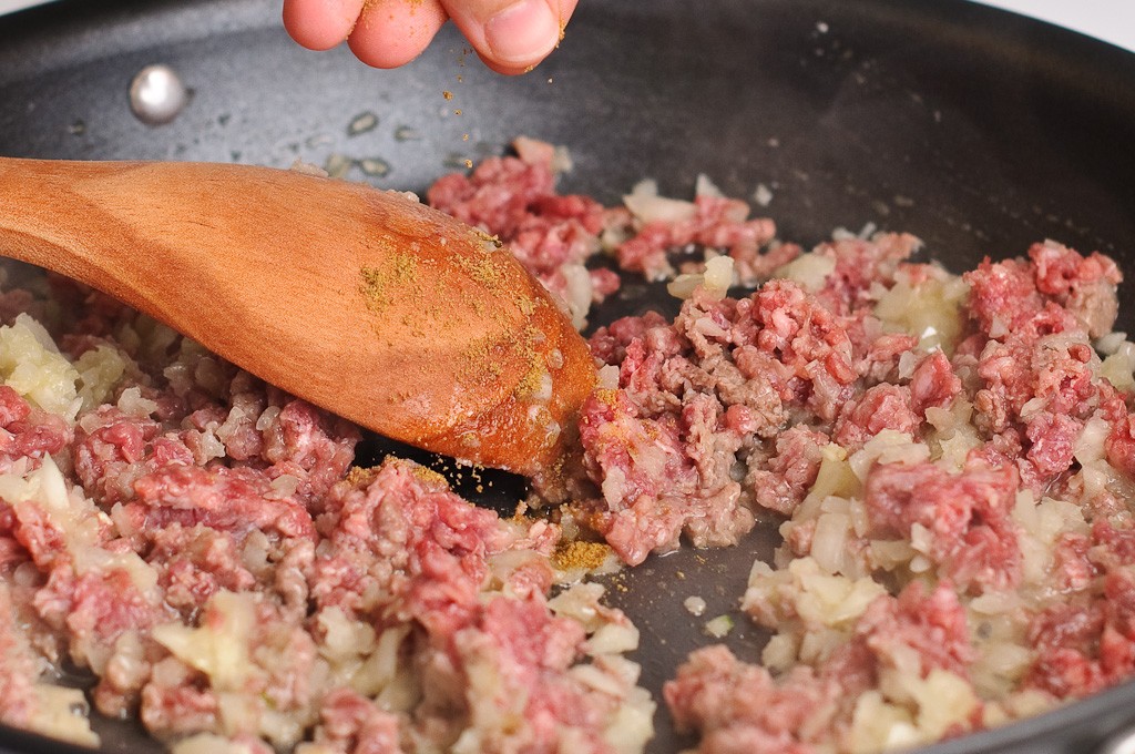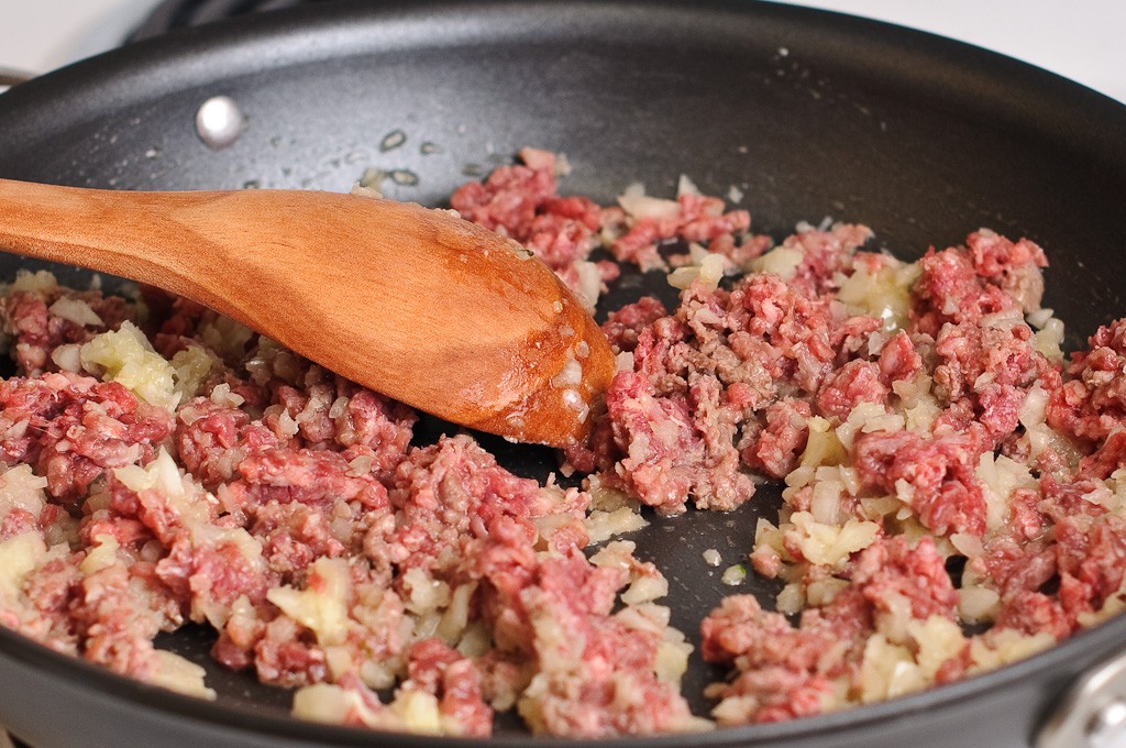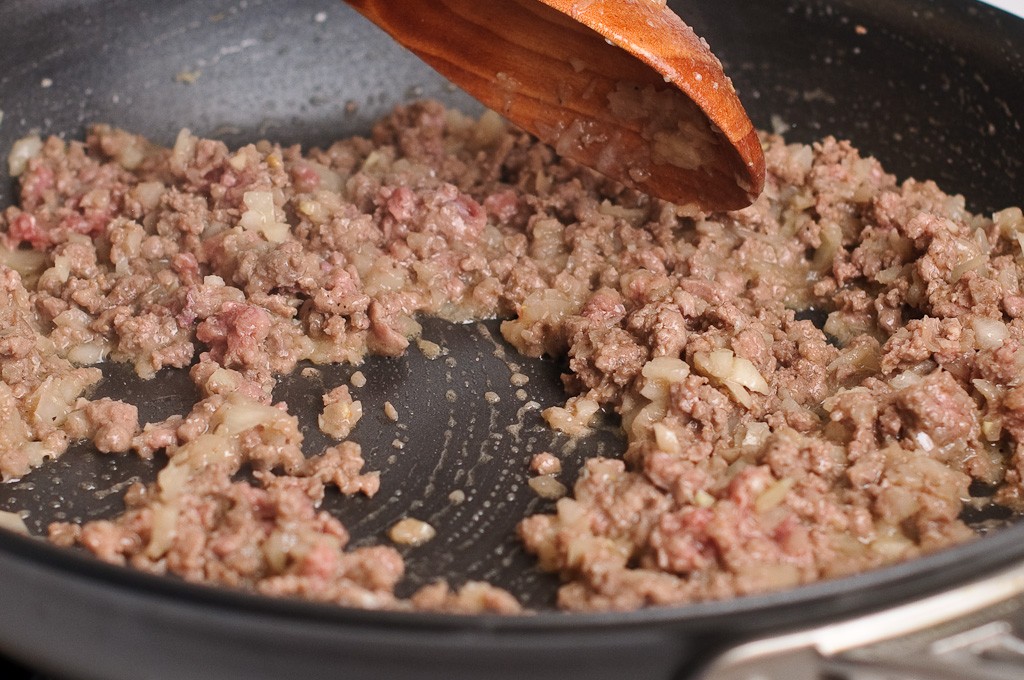 و أثناء رفع العجين يمكنك عمل خليط الطبقة العليا وذلك كالاتي : سخني المقلاة علي درجة حرارة متوسطة و قومي بوضع الزبدة و البصل و الثوم المفروم و التقليب حتي يصبح البصل شفاف ثم ضفي خليط اللحم المفروم و الملح و الفلفل و الكمون و القلي لمدة 4 – 5 دقائق حتي يتحول لون الخليط كما هو مبين في الصور ثم إرفعي الخليط من علي الحرارة و ضعيه علي جانب .