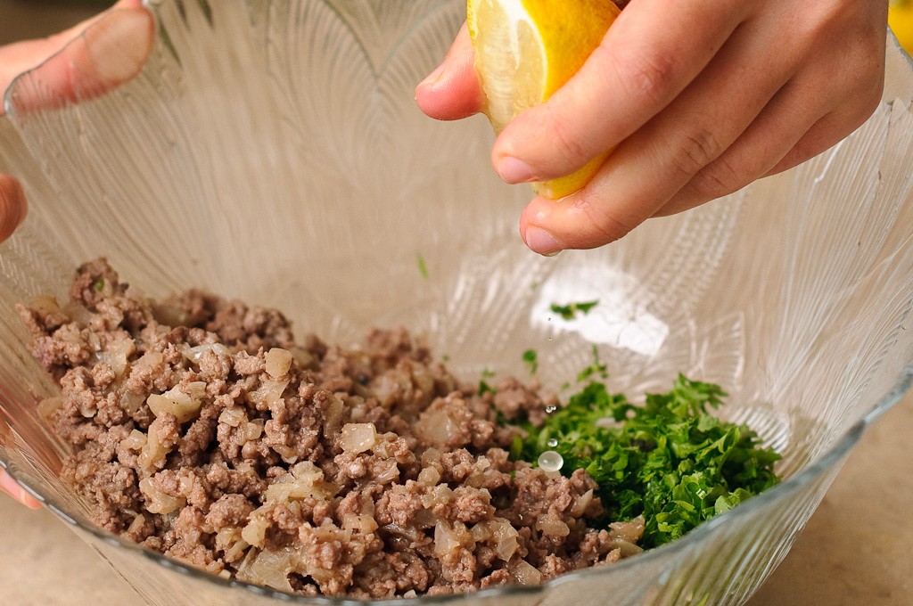 . قومي بتقطيع الطماطم إلي مكعبات و تجهيز وعاء متوسط الحجم لخلط كل من خليط اللحم المفروم مع النعناع المفرو م و معكبات الطماطم و البقدونس المفروم و عصير الليمون و مزج هذه المكونات جيداً و تسخينه في الفرن لبضع دقائق .