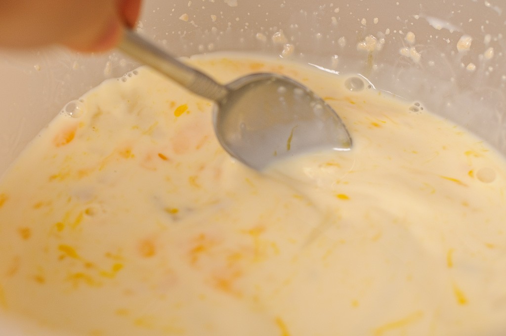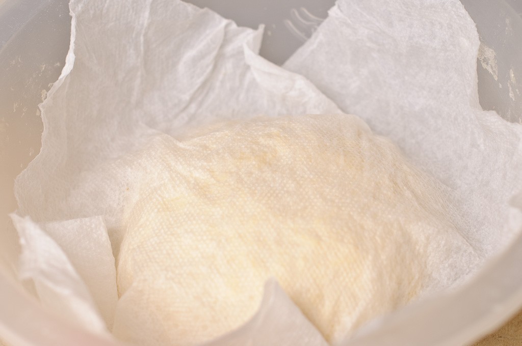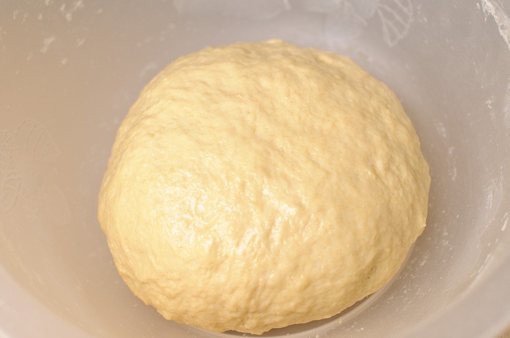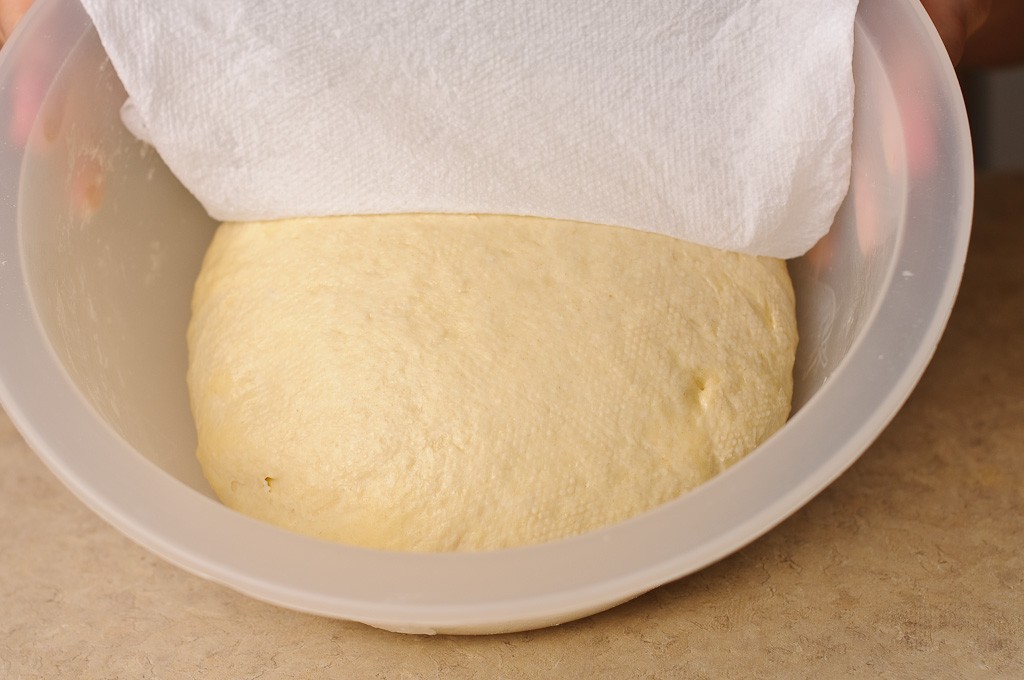 تأكدي من أن الحليب دافئ قليلاً . ثم قومي بوضع الحليب في وعاء متوسط الحجم و ضفي الخميرة و البيض و الملح و السكر و الزيت و خلطهم جيداً قبل إضافة الطحين و العجن جيداً. قومي بدهن العجين بالقليل من الزيت مع تغطيته بقماش مبللة و منشفة أخري و تركه لمدة 30دقيقة .