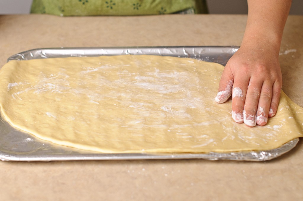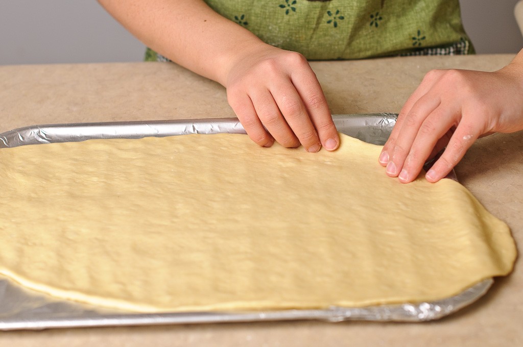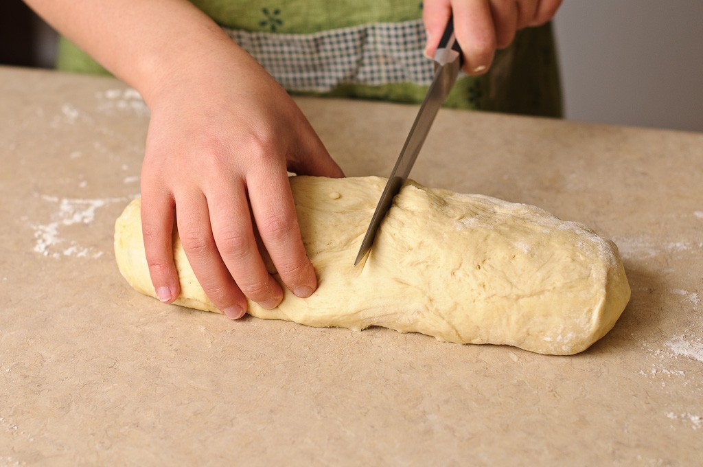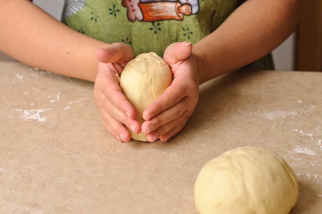 و بمجرد أن يتضاعف حجم العجين قومي بتجهيز سطح العمل و رش كمية قليلة من الدقيق قومي بتقطيع العجين إلي قطعتين . تقطيع العجين إلي كرتين وفرده علي شكل بيضاوي علي شكل بيضاوي .