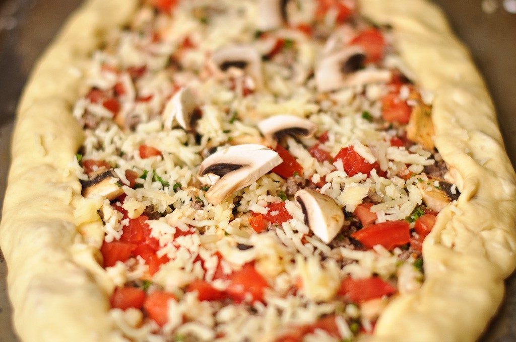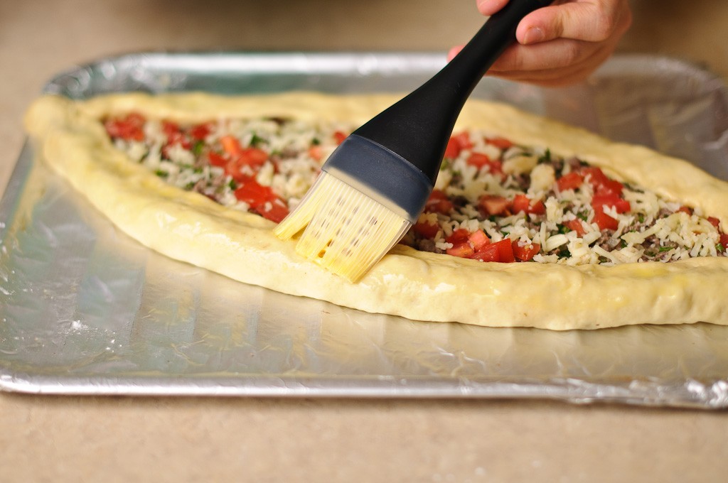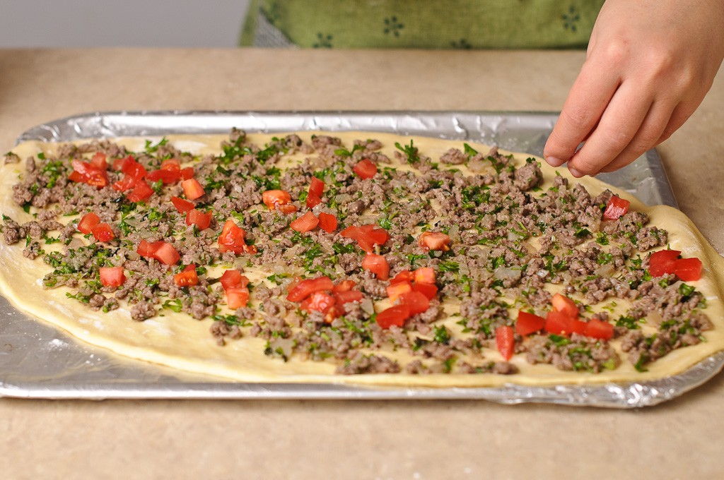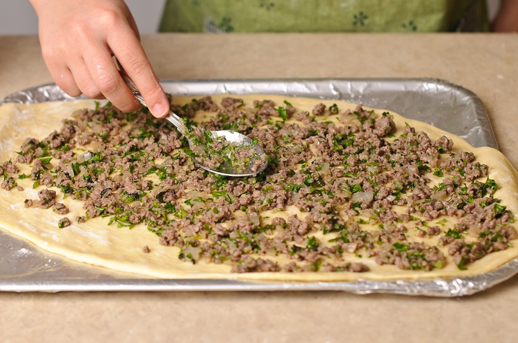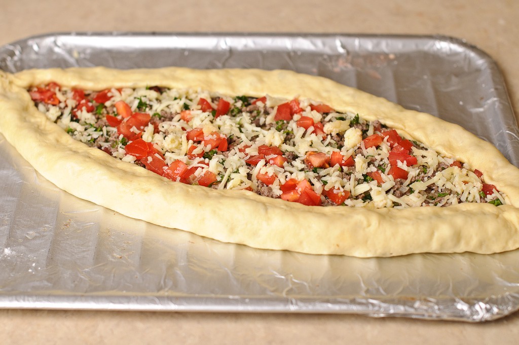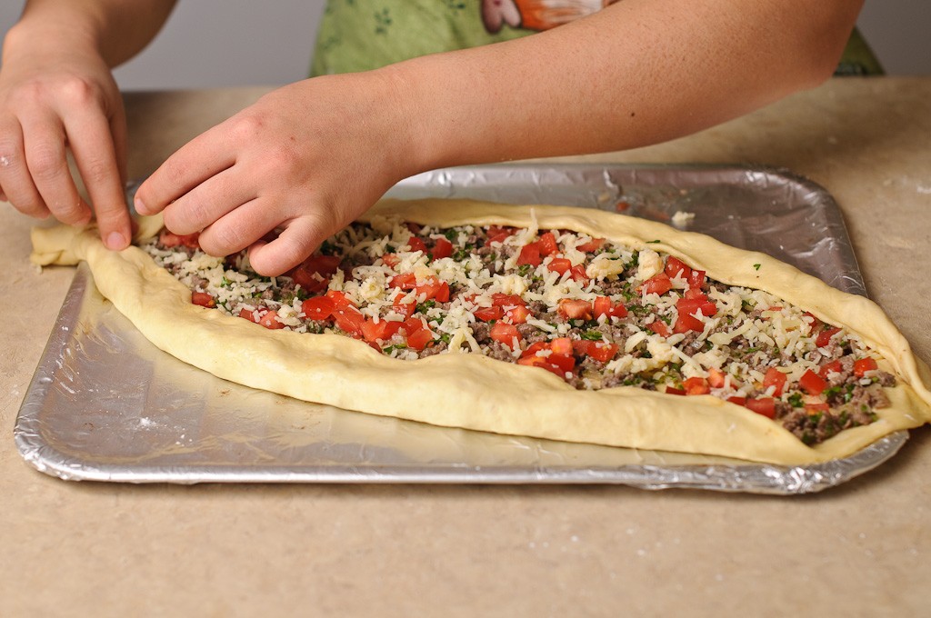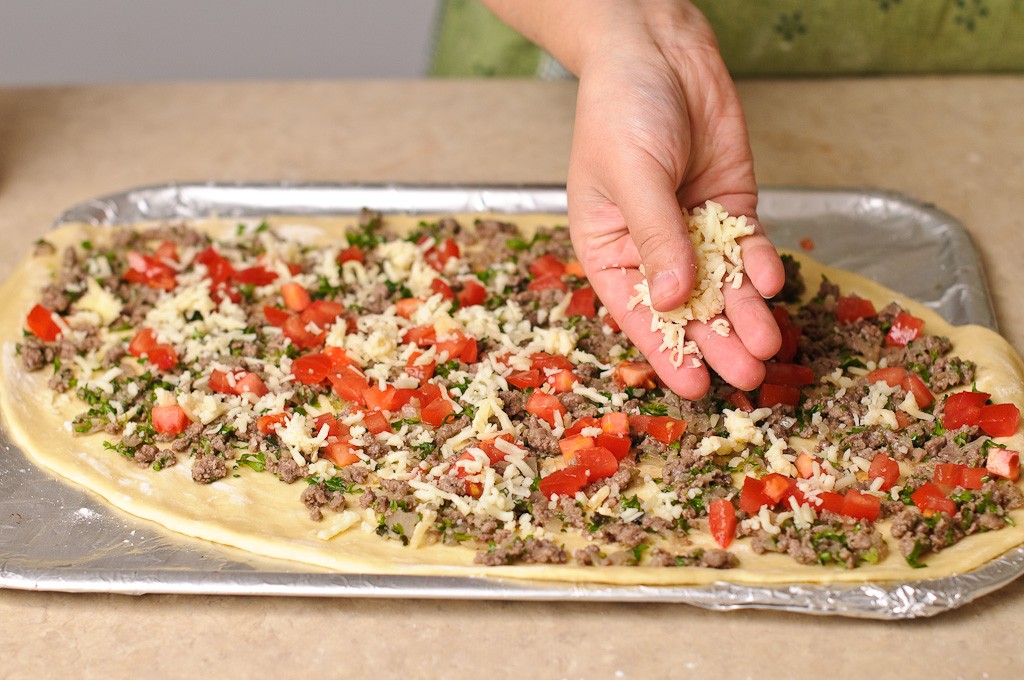 قومي بنقل العجين علي ورق الخبز وفرده علي القليل من النشا قومي بتوزيع خليط اللحم المفروم و الجبن الموزاريلا المبشورة . قومي بثني جوانب العجين حتي يصبح مثل القارب